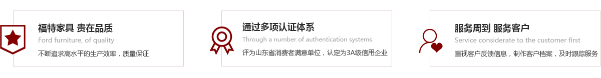公司全體員工緊緊牢記“福特家具,貴在品質(zhì)”的承諾,本著“以質(zhì)量求生存,以信譽(yù)求發(fā)展”、“誠實(shí)守信”的企業(yè)理念,力爭“創(chuàng)名優(yōu)企業(yè),鑄優(yōu)質(zhì)品牌”,在全公司上下兢兢業(yè)業(yè)、認(rèn)認(rèn)真真,嚴(yán)格要求自己,不斷追求自已,不斷追求更高水平的生產(chǎn)效率,我公司注重質(zhì)量管理,先后通過了國際質(zhì)量管理體系ISO9001認(rèn)證、國際環(huán)境管理體系14001認(rèn)證、職業(yè)健康安全管理體系OHSAS18001認(rèn)證,公司注重品牌建設(shè),先后注冊了“世紀(jì)福特”、“杰福特”、“伯爵”三個系列商標(biāo),公司連續(xù)多年被煙臺市工商局授于“市級守合同重信用企業(yè)”稱號,連續(xù)被山東省工商局授于“省級守合同重信用企業(yè)”稱號,被山東省企業(yè)信用與社會責(zé)任協(xié)會評為“優(yōu)秀企業(yè)會員”稱號,連續(xù)被煙臺市消費(fèi)者協(xié)會評為消費(fèi)者滿意單位,連續(xù)被山東省消費(fèi)者協(xié)會評為第八屆、第九屆山東省消費(fèi)者滿意單位,被認(rèn)定為AAA級信用企業(yè),隨著社會環(huán)保意識的不斷提高,公司2014年4月順利通過了中國環(huán)境標(biāo)志產(chǎn)品認(rèn)證,2015年8月順利通過了中國質(zhì)量認(rèn)證中心CQC環(huán)保產(chǎn)品認(rèn)證,并于2015年12月被評為“山東省著名商標(biāo)”榮譽(yù)稱號。